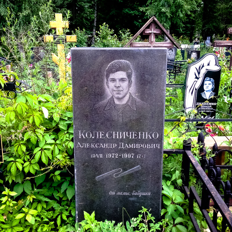 А вот памятник Колесниченко Александра от мамы и бабушки (вы не написали на могиле, что она от вас? Срочно исправляйтесь, люди подумают, что не только вы занимались организацией похорон!). Под улыбающимся 17-летним юношей изображен символ 90-х годов — нунчаки!