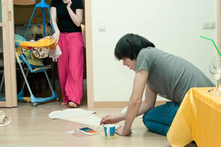 Я ползал и портил обои хозяевам (кстати, в первой фотографии вот этой фотосессии мы уже испортили половину обоев-остатков, сейчас прикончили остальные. Ну разве кто-нибдуь когда-нибудь воспользовался этими обрезками по назначению?), реквизит для итоговой фотографии готовили долго: вырезать и раскрасить семь громадных мороженных не просто )