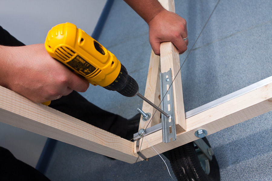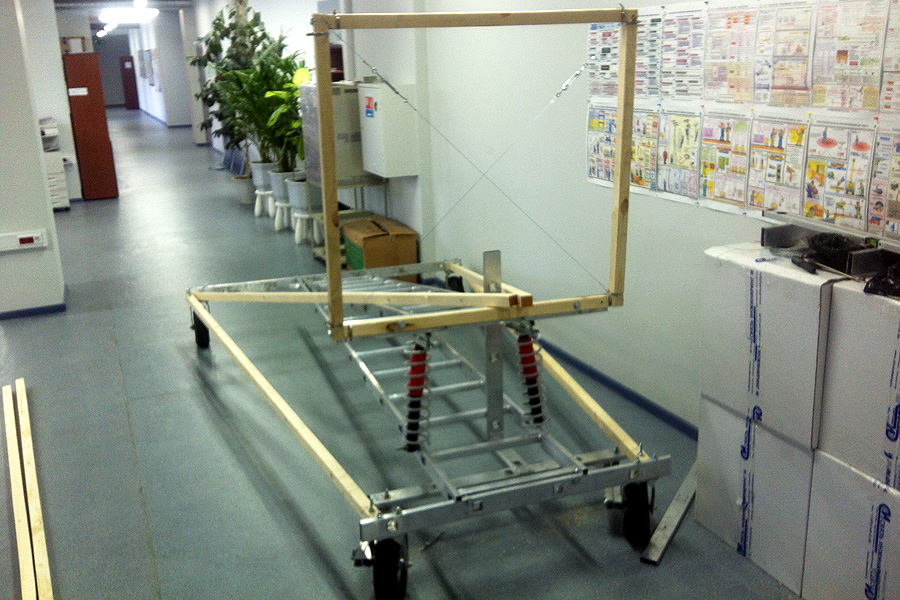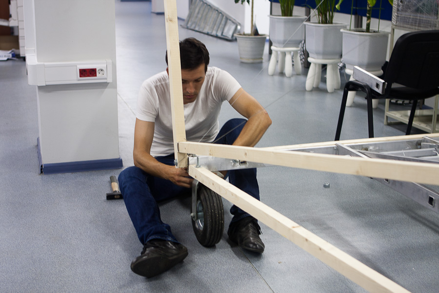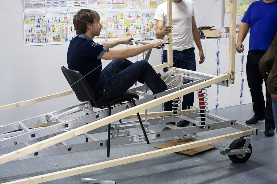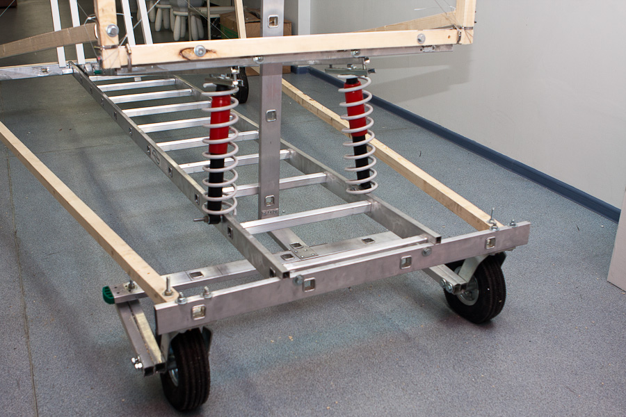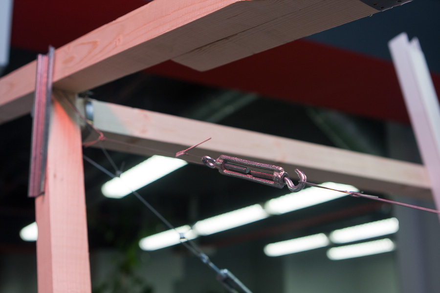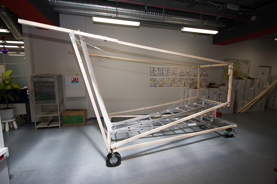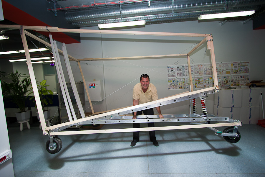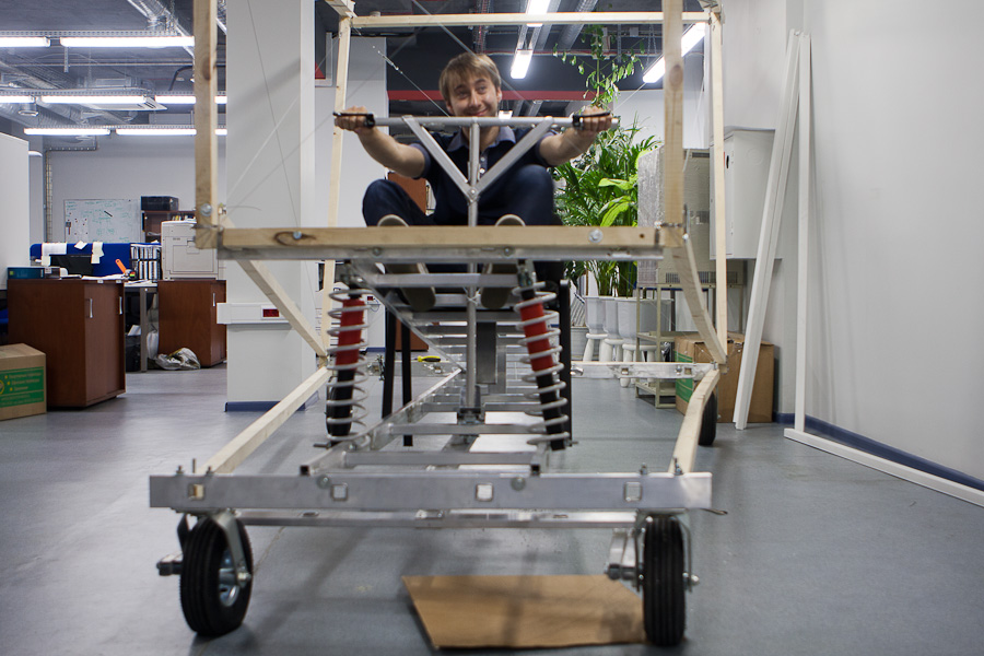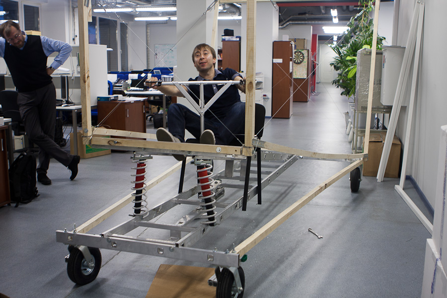 Для того, чтобы выровнять конструкцию до углов в 90 градусов оказалось очень удобно использовать тросики по диагоналям. Изначально мы долго спорили, дадут ли они какой-то прок или нет, но когда сделали, поняли, что эффект поразительный: конструкция крепкая и легко настраиваемая. Единственная проблема заключается в аварийной ситуации, вдруг пилот вылетит за края тележки? Ему тогда придется встретиться с сильно натянутыми тросиками ))) Помните эпизод из фильма «Обитель зла»? В своем кругу стали называть эту конструкцию «яйцерезка» (у меня в детстве у мамы было такое приспособление для красивого нарезания варенных яиц).