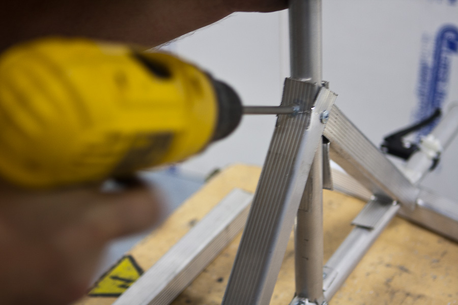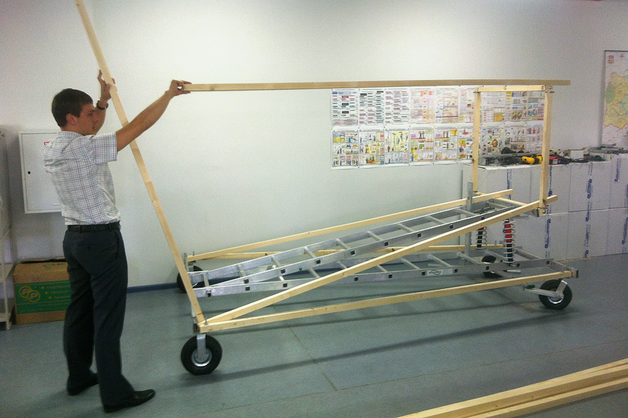 Конструкция должна быть прочной, но при этом не превышать по весу 80 кг, поэтому выбираем в качестве основных материалов алюминий и дерево. В голову приходит мысль, что обычная лестница может нам сильно помочь, прикидываем: