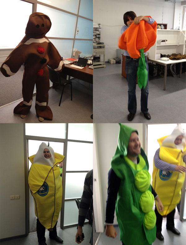 Параллельно другие участники команды занимаются подбором костюмов, пилота наряжаем печенькой, разгоняющих — морковкой (я), перчиком, горошком и бананчиком )))