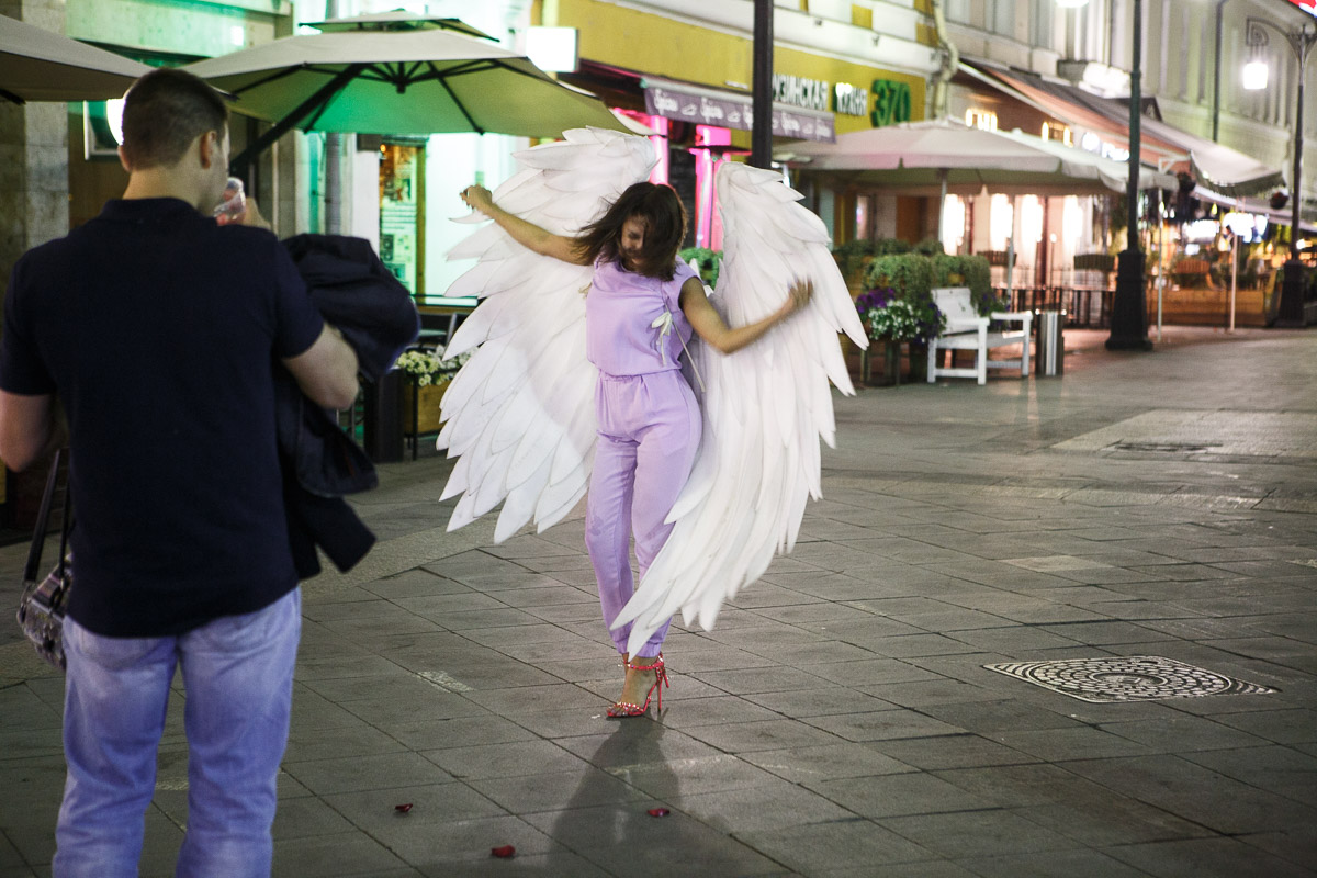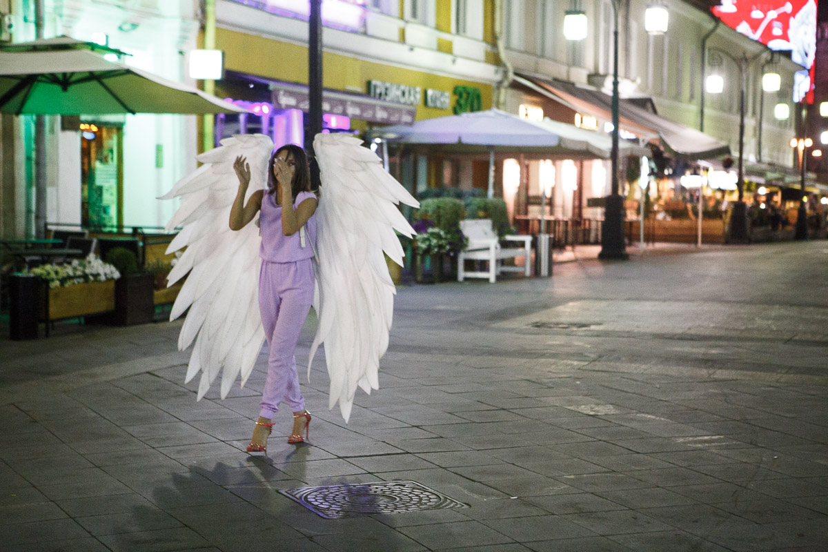 56 Триптих «Ангел, да не нужны тебе крылья!». Второй год подряд возвращаюсь из далекого велопутешествия на двухколесном друге из аэропорта, и колеса ведут меня чрез «пару пива» на Камергерском. На этот раз Ангел не успел и слова сказать, девчонки сразу отобрали крылья.