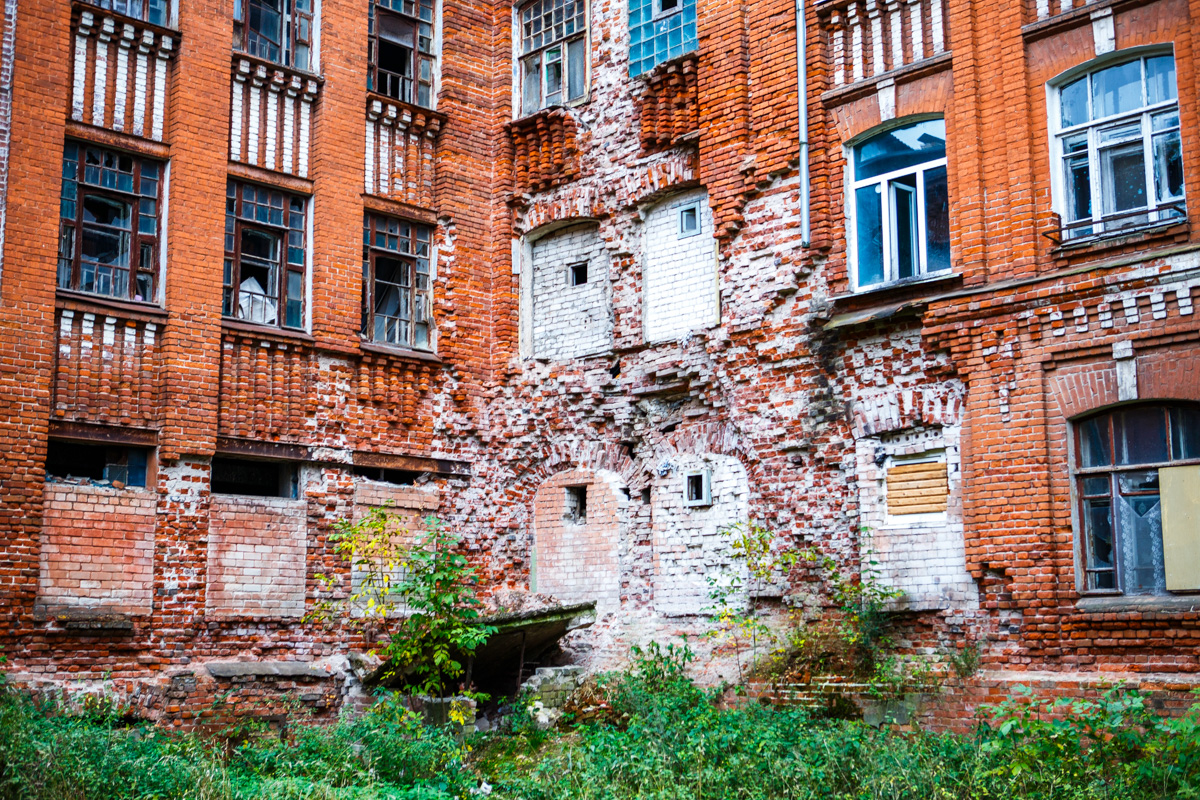 Мой друг Михаил подсказал нам чудесное развлечение в этом городе — Морозовские Казармы (это не тот же самый Савва Морозов, который отстраивал Орехово-Зуево или там микрорайон Саввино, но из его рода). Очень жаль, что город пока не нашел инвестора, как могли попытались защитить и законсервировать: